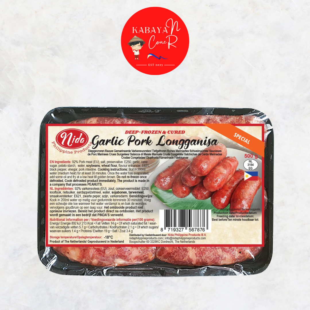Nida Pork Longganisa Garlic 500g is a Filipino sausage made with 92% pork and rich garlic flavor. Perfect for “longsilog,” it’s juicy, savory, and easy to cook by boiling then pan-frying